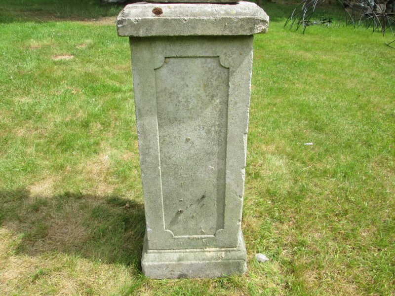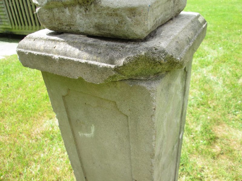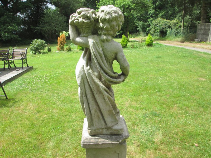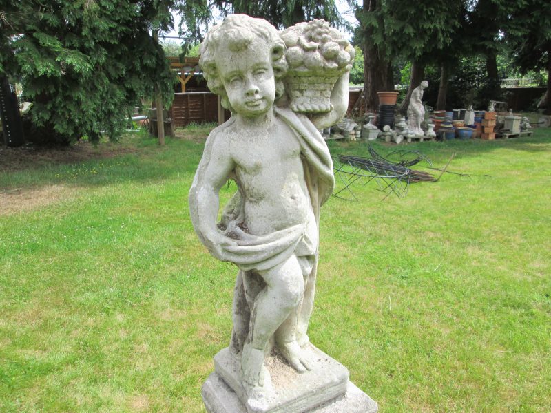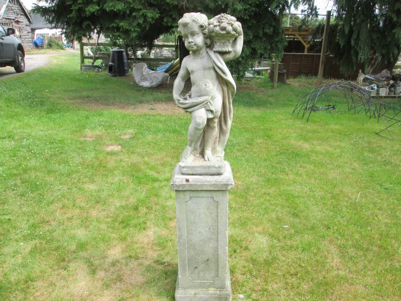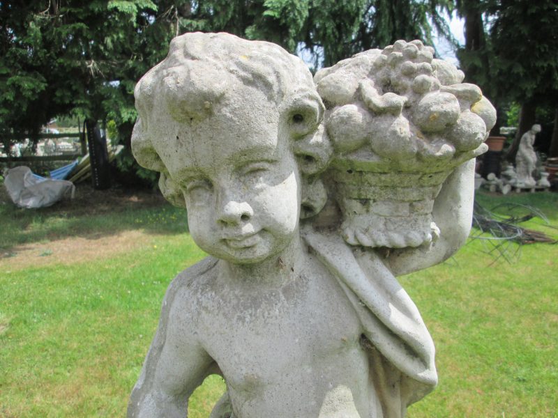 an attractive concrete cherub statue holding a basket of fruit on an earlier, tall, weathered plinth. the plinth is all one piece and has a chip to one corner.