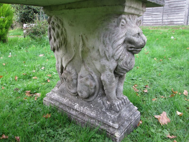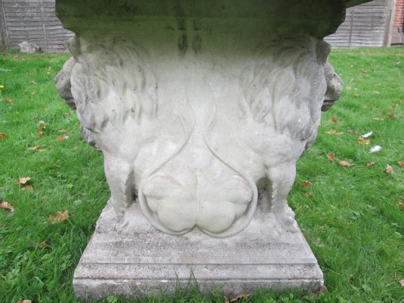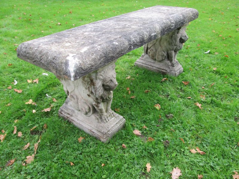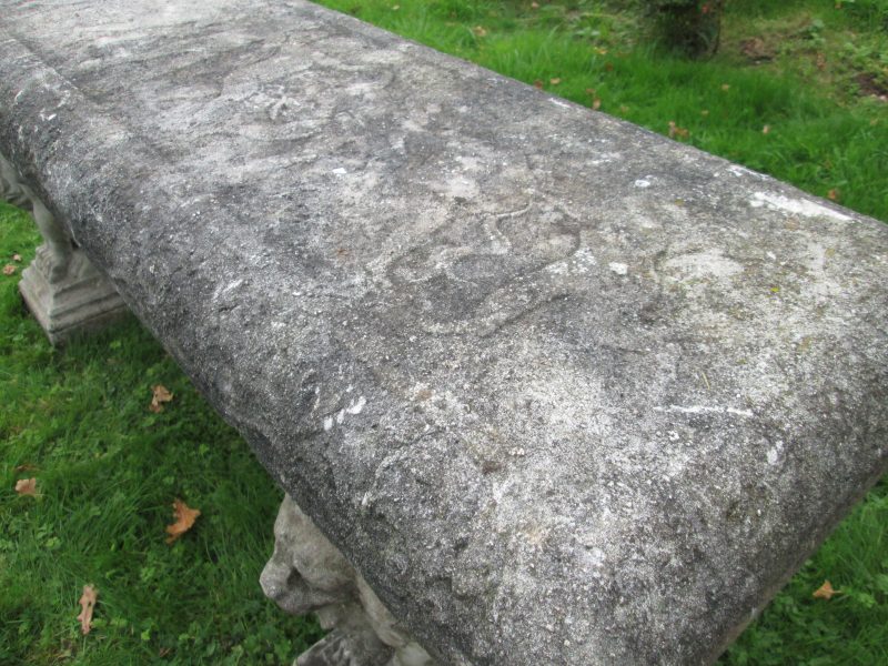 very attractive large reconstituted stone bench with lion head plinths. also has some design and slight relief to the seat itself. quality piece with sharp detail – a must see.