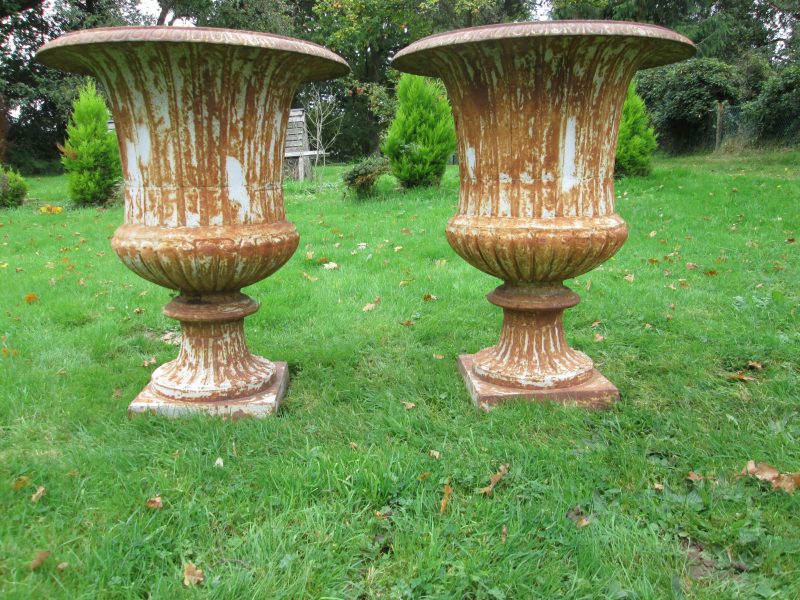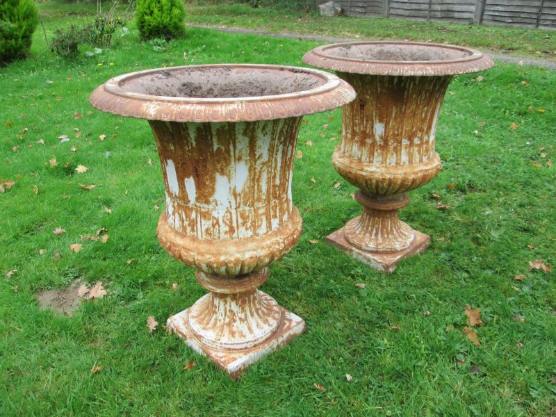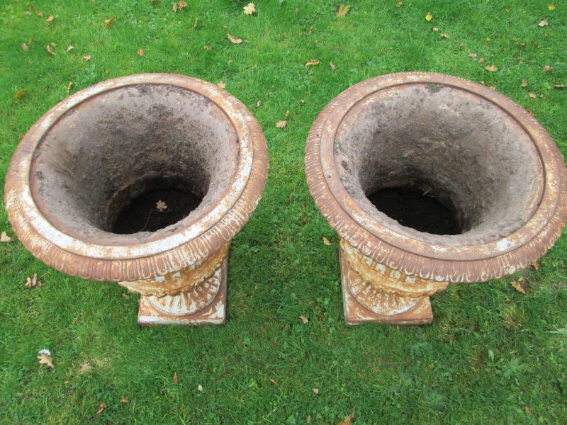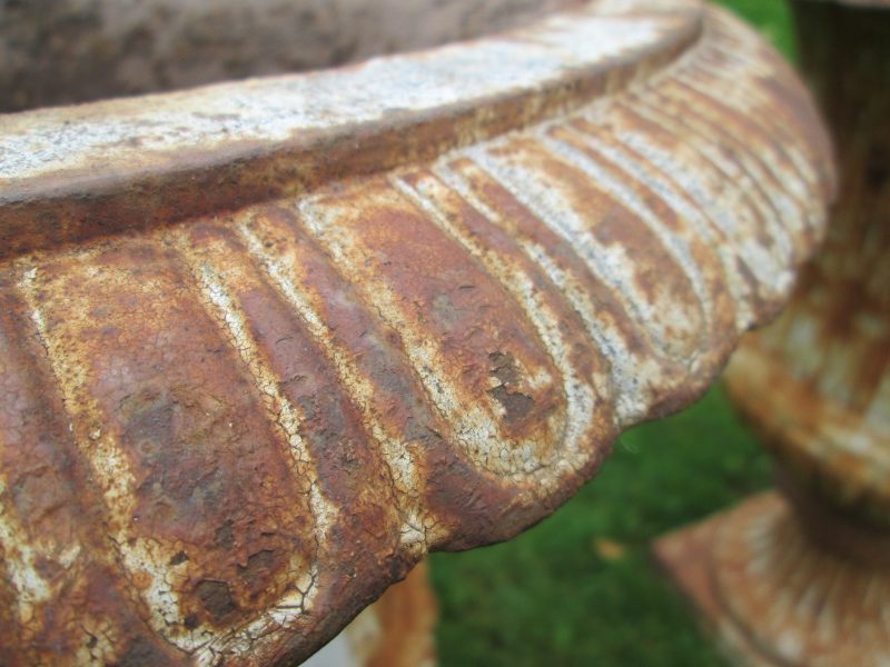 good sized pair of cast iron urns. great condition with only aesthetical surface rust.