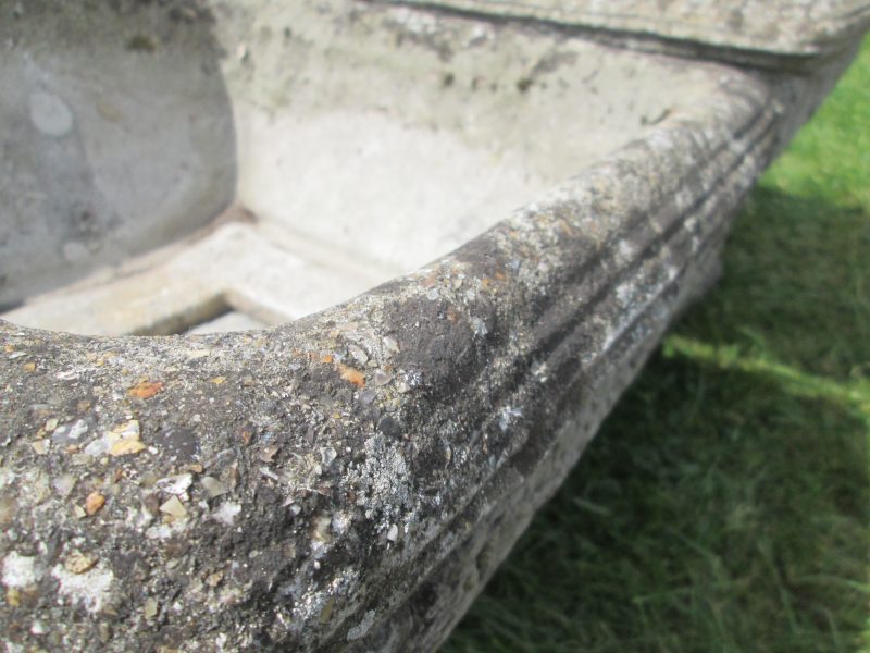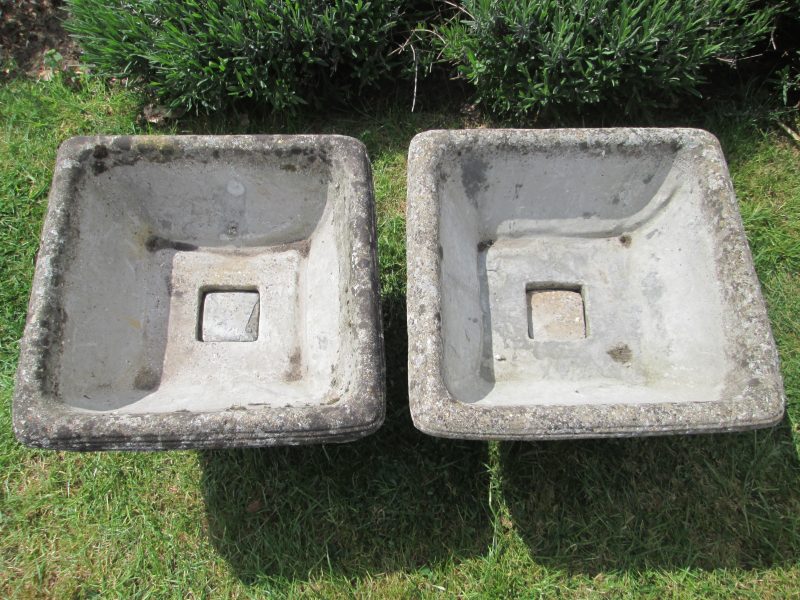 large pair of square concrete planters with a decorative, floral design. they come apart in two pieces with the top simply sitting on the small base plinth.