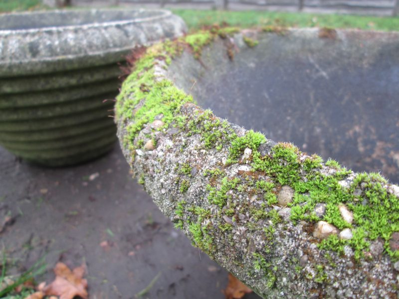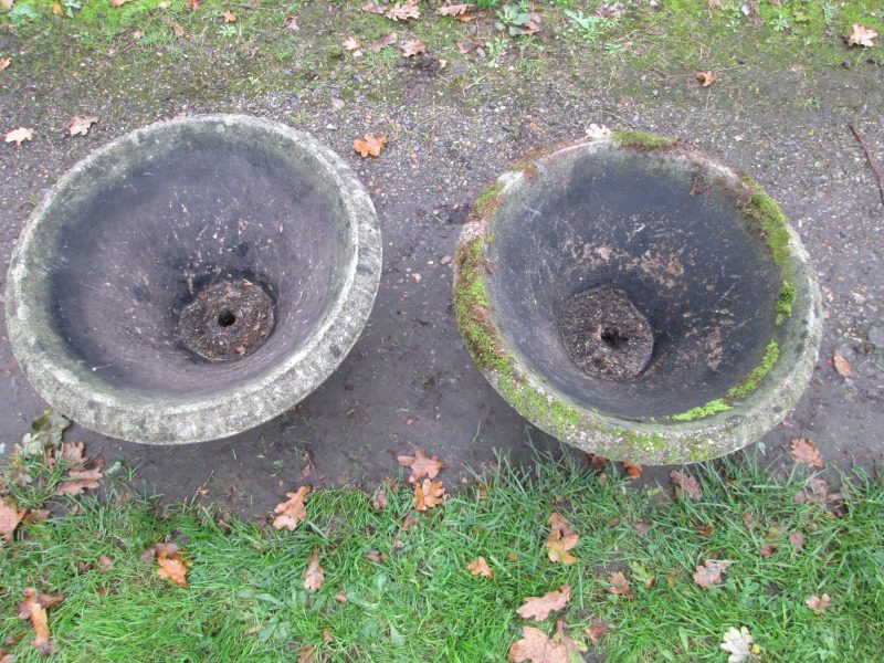 weall weathered (but structurally sound) small pair of conical shaped planters with a ribbed design.