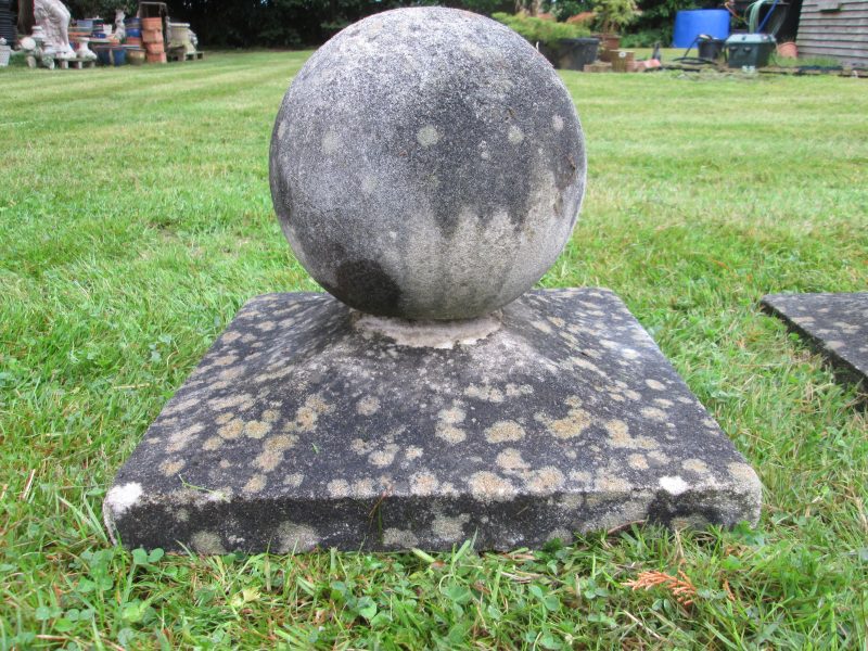 small pair of ball finial pier caps, very attractively weathered. the balls have a metal rod protruding from them which goes right through the pier cap itself (to hold them on) with a few inches to spare which would then go into the pillar itself.
