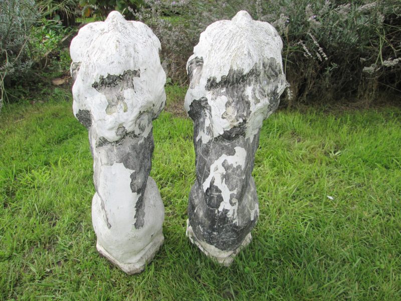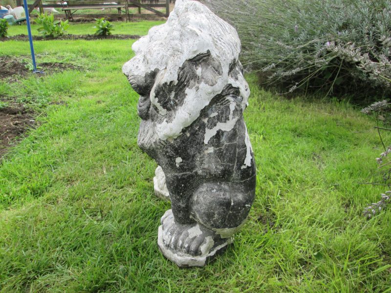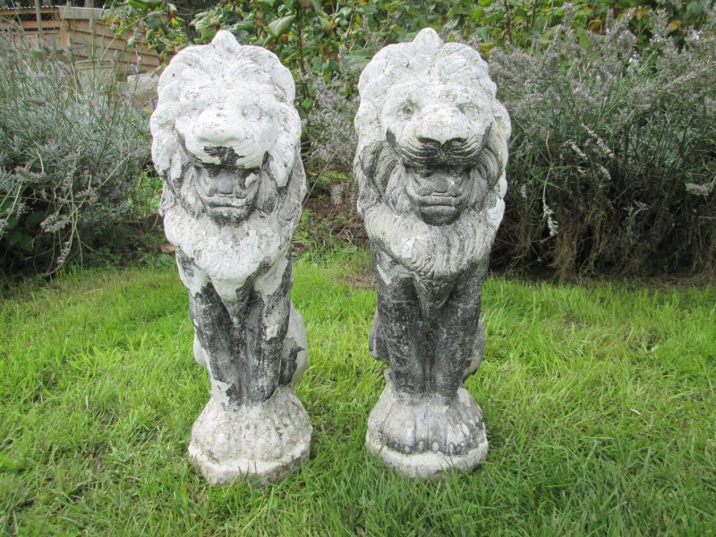 small pair of concrete lions figures which have been previously painted but now is flaking off to give an antique look. ideal for gatepost/pillar tops.